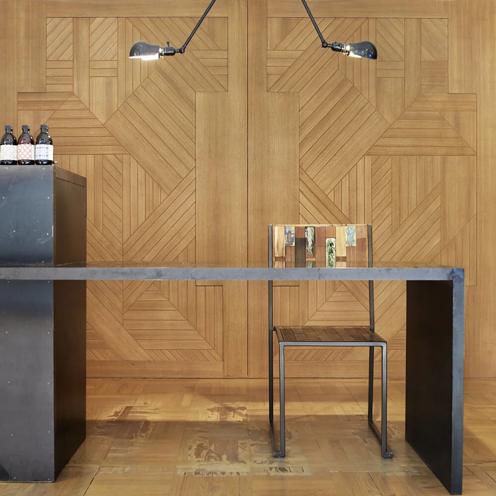 A raw steel plated reception counter, 1950's industrial style pendant light and a distressed reclaimed wooden chair creates an edginess in front of the geometrical refined wood wall feature in the reception area.