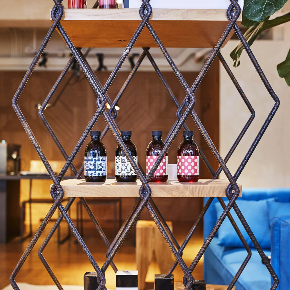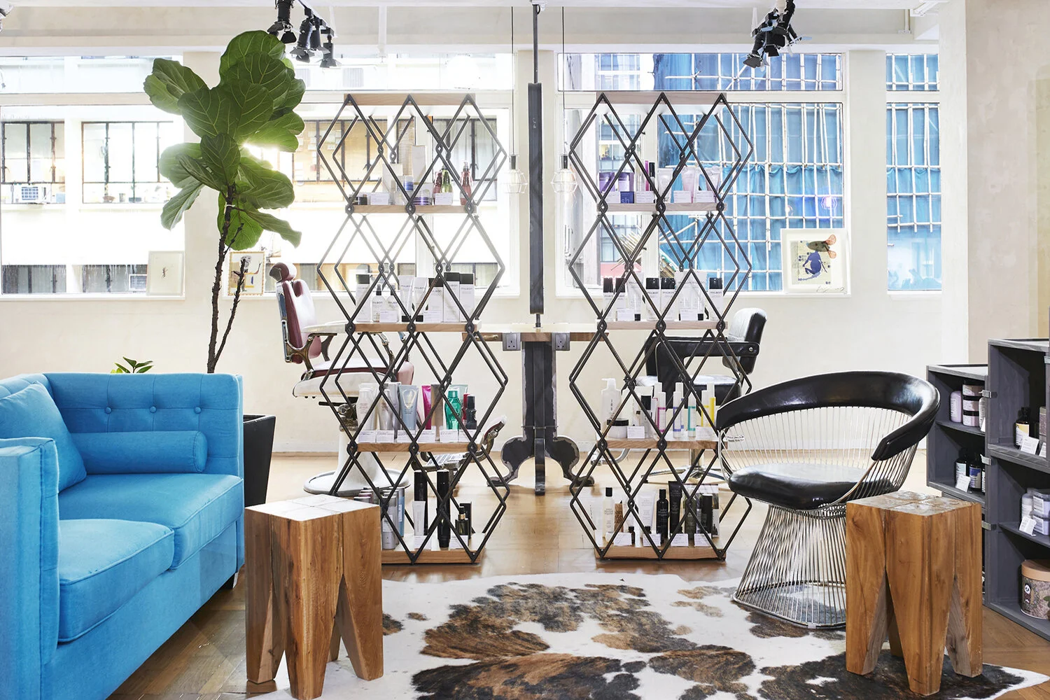 Scandinavian influences are infused into the waiting area along with a comfy eye-catching sky blue sofa, raw wood block side tables and cow hide rug to offer a warm and cosy chill out corner for both clients and staff alike. Construction steel bars were used to build the product display units which also function as a see-through partition separating the waiting and work areas. Beyond the partition, are two original 1970’s Japanese vintage barber chairs in lip-plumping red which serves as a focal point behind the steel bars.
