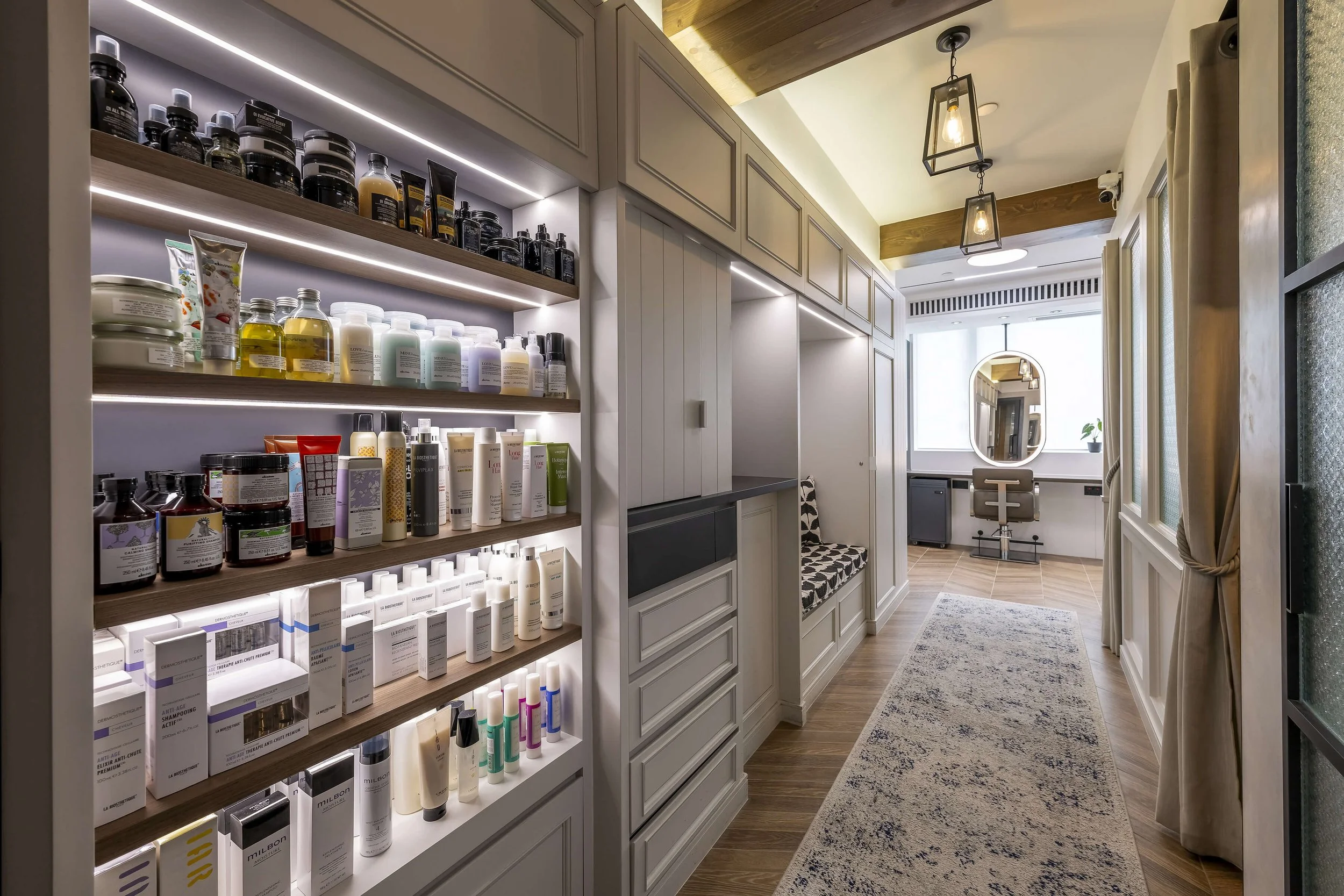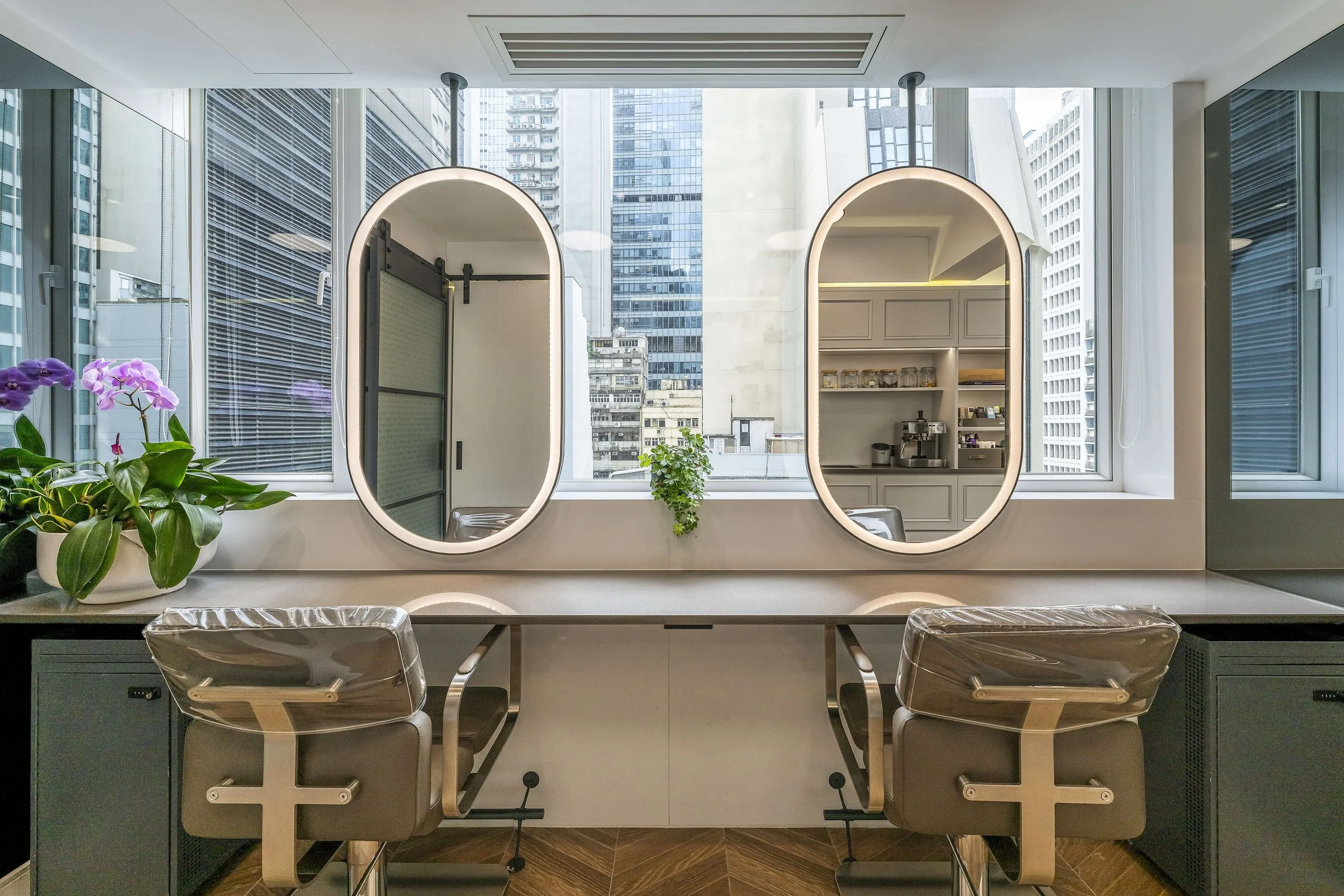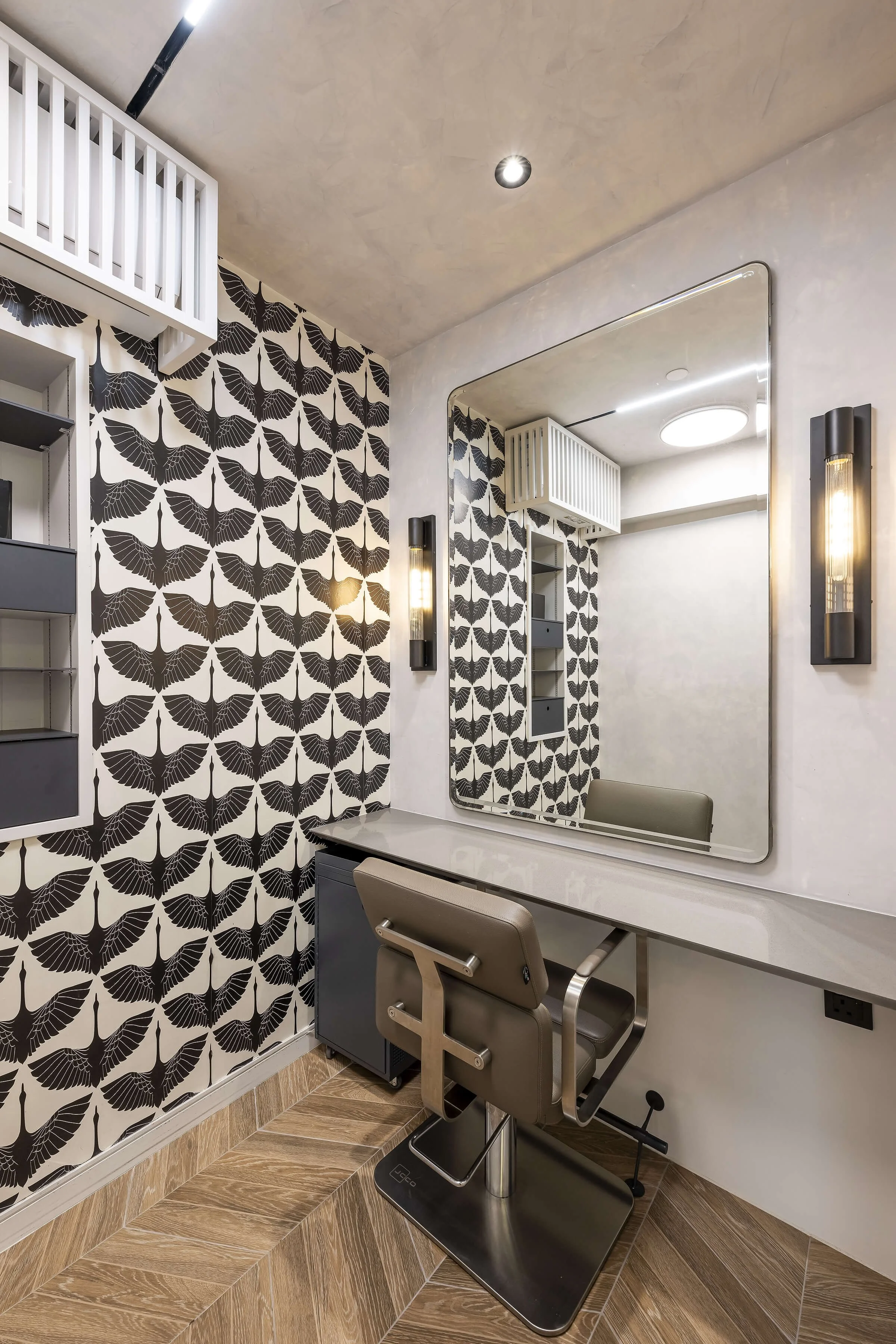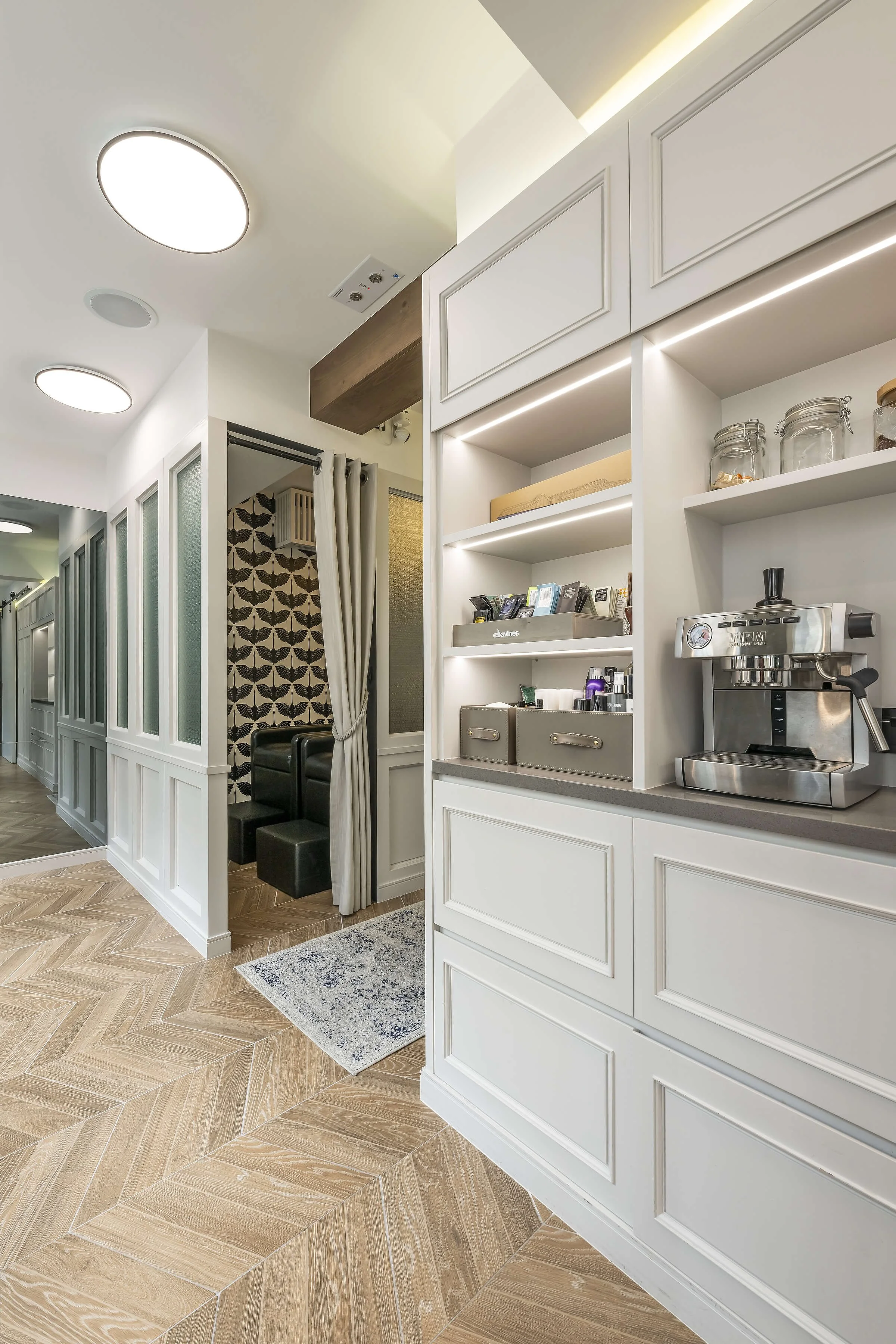 Scandinavian influences are infused into the waiting area along with a comfy eye-catching sky blue sofa, raw wood block side tables and cow hide rug to offer a warm and cosy chill out corner for both clients and staff alike. Construction steel bars were used to build the product display units which also function as a see-through partition separating the waiting and work areas. Beyond the partition, are two original 1970’s Japanese vintage barber chairs in lip-plumping red which serves as a focal point behind the steel bars.