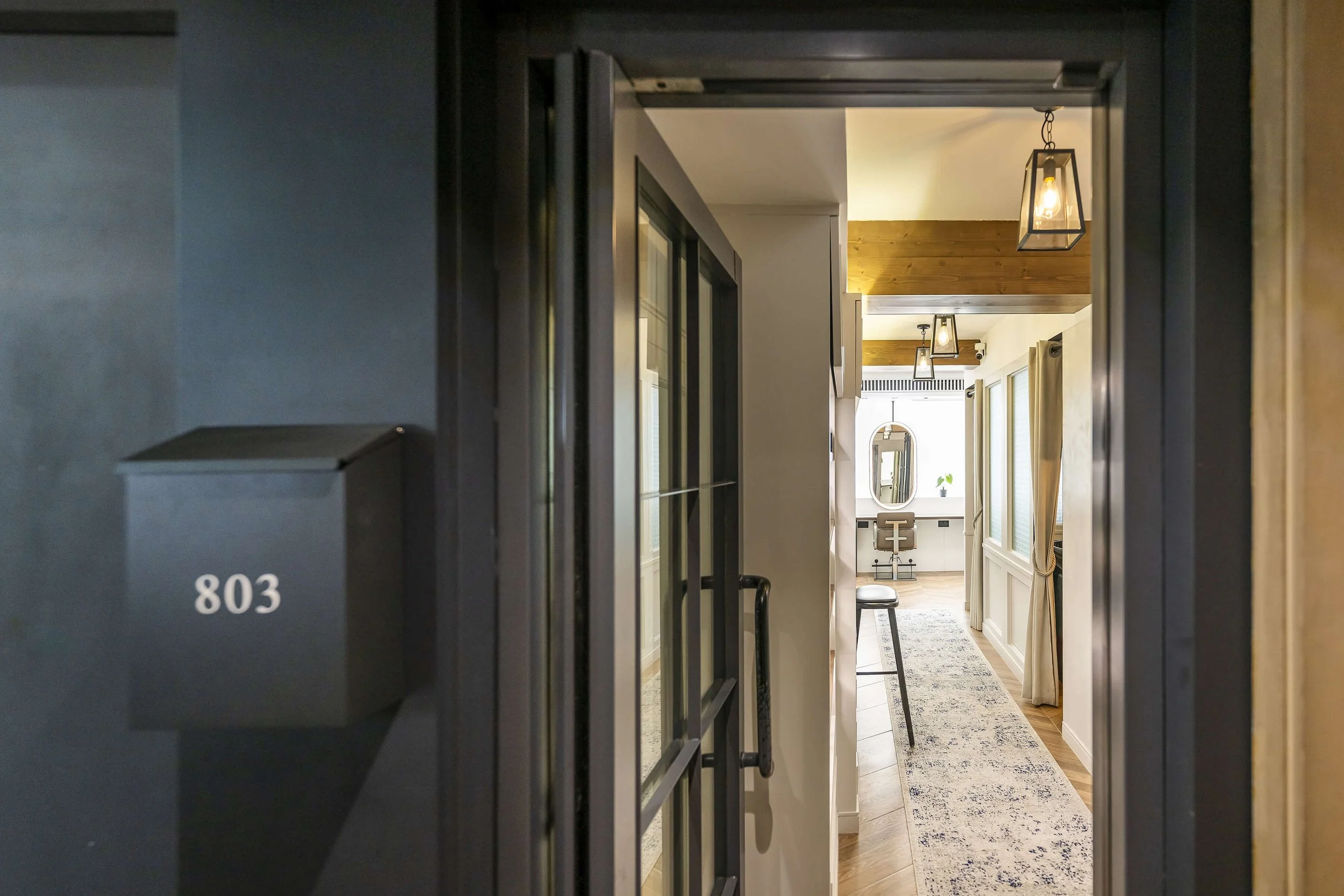 A raw steel plated reception counter, 1950's industrial style pendant light and a distressed reclaimed wooden chair creates an edginess in front of the geometrical refined wood wall feature in the reception area.