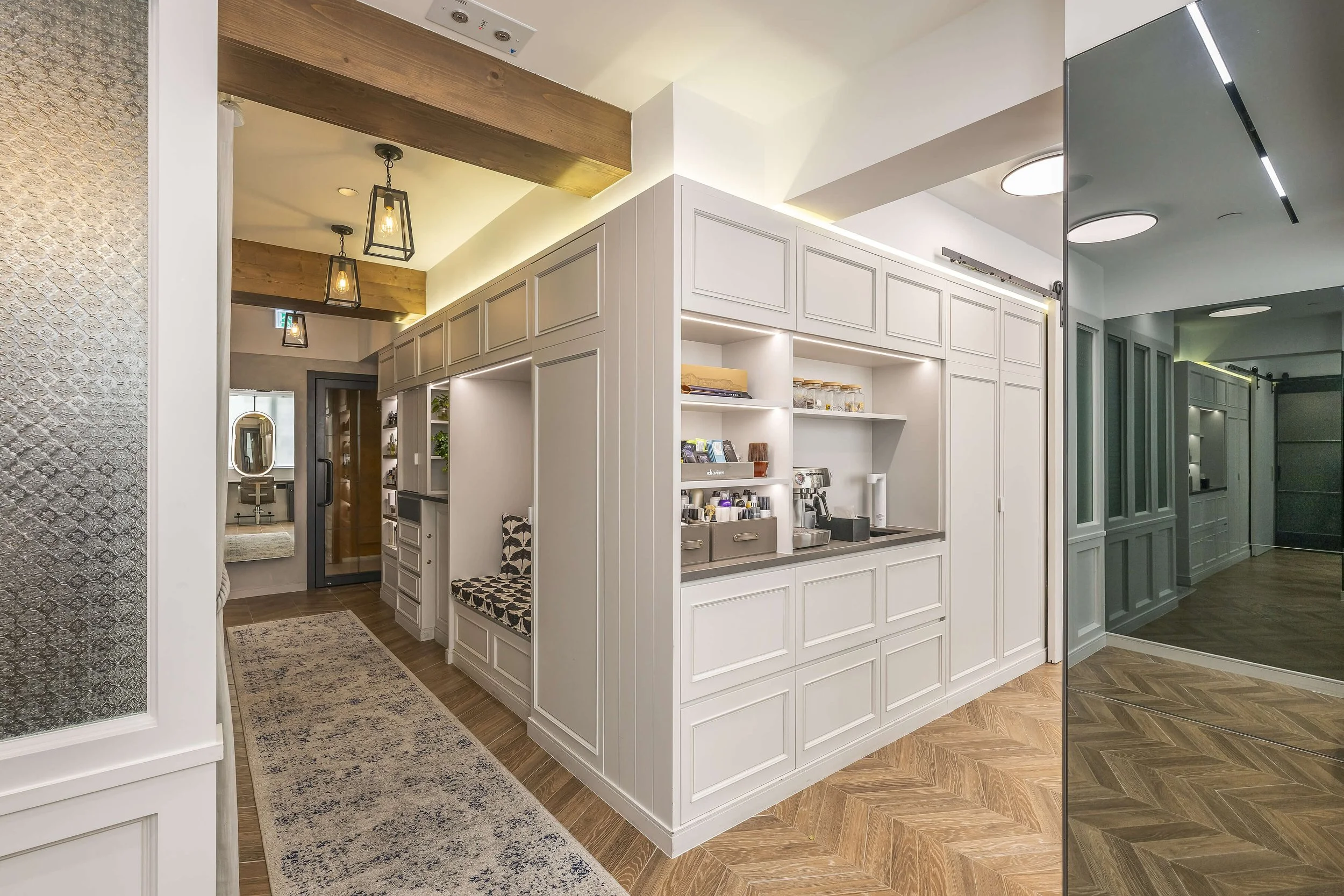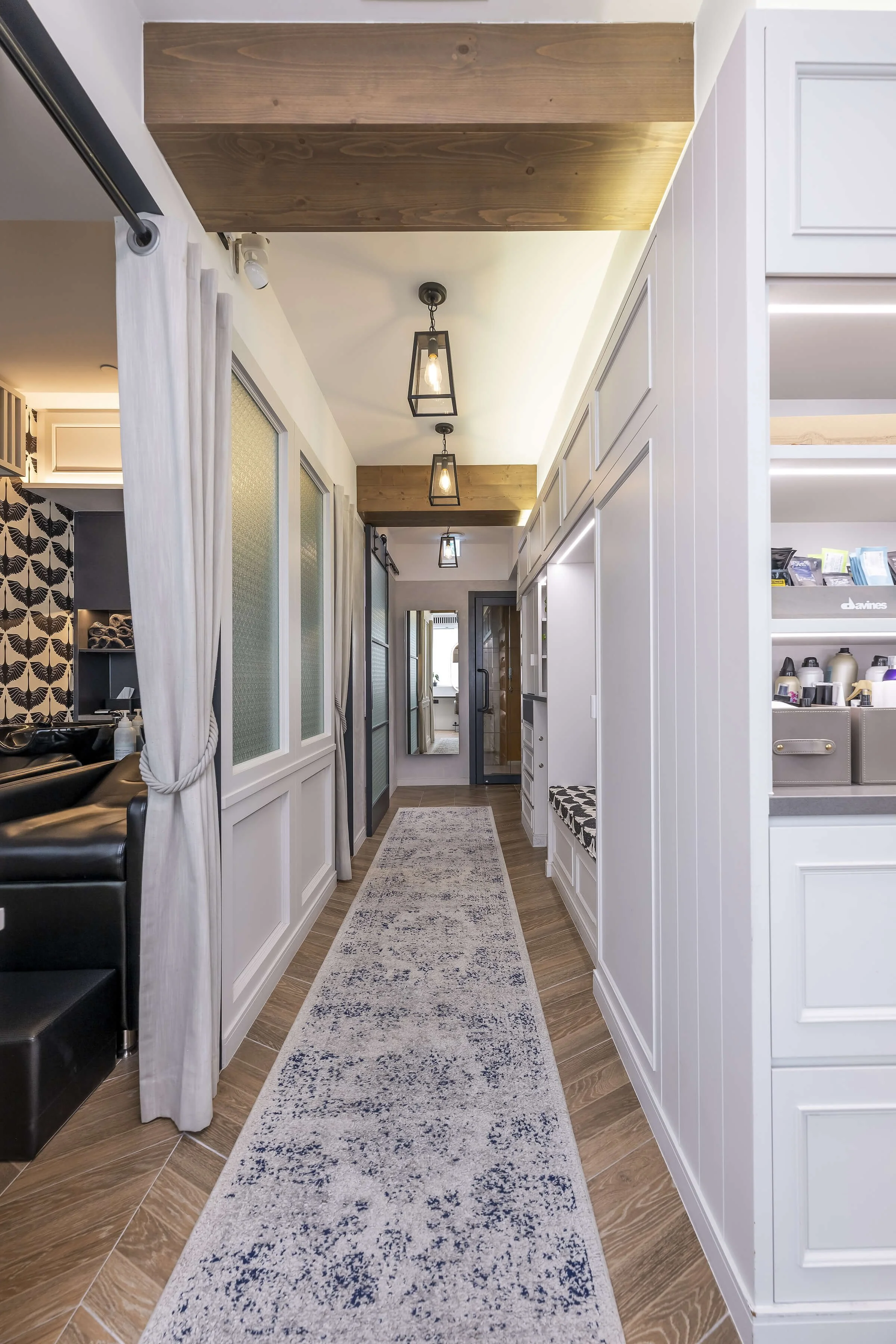 Recycled raw edged wood pieces held together by traditional Japanese butterfly joints form the styling counter tops which are supported by bespoke vintage-style cast iron bases. A neutral colour stucco wall along with the original wood floor gives an overall relaxing and warm sensibility to the salon.