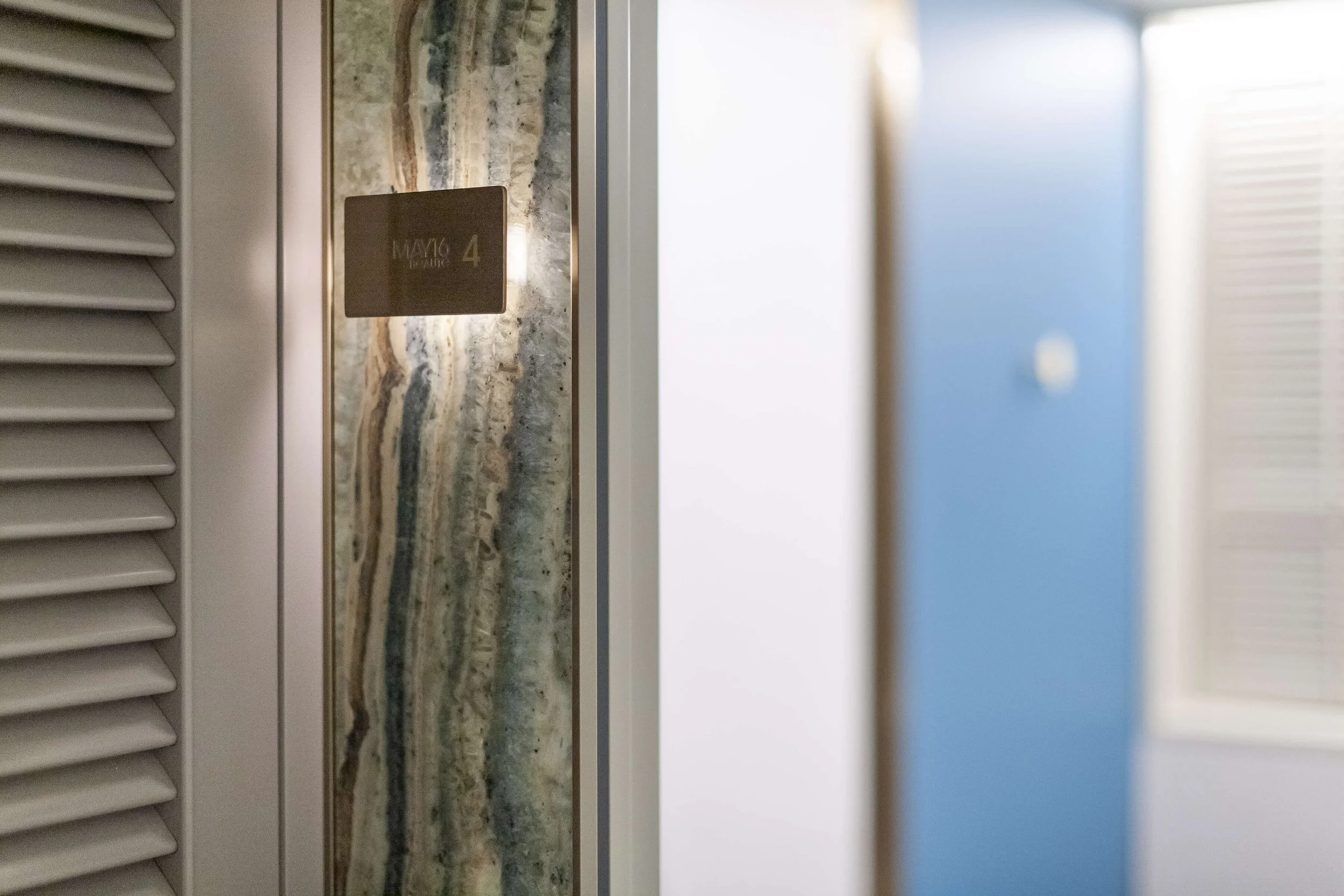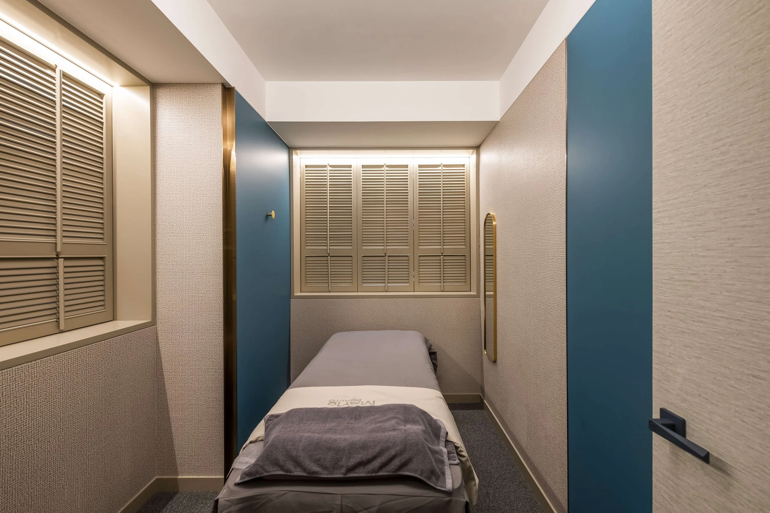 A stunning bluish natural stone panel with a backlit bronze room number plate welcomes clients to the beauty rooms, preparing them for their pampering sessions. The beauty rooms are designed with panels in calming shades of blue, reminiscent of the sky and water, which are closely associated with tranquility and relaxation. This is enhanced by Amani textured wallpaper, creating a serene and contemporary space.