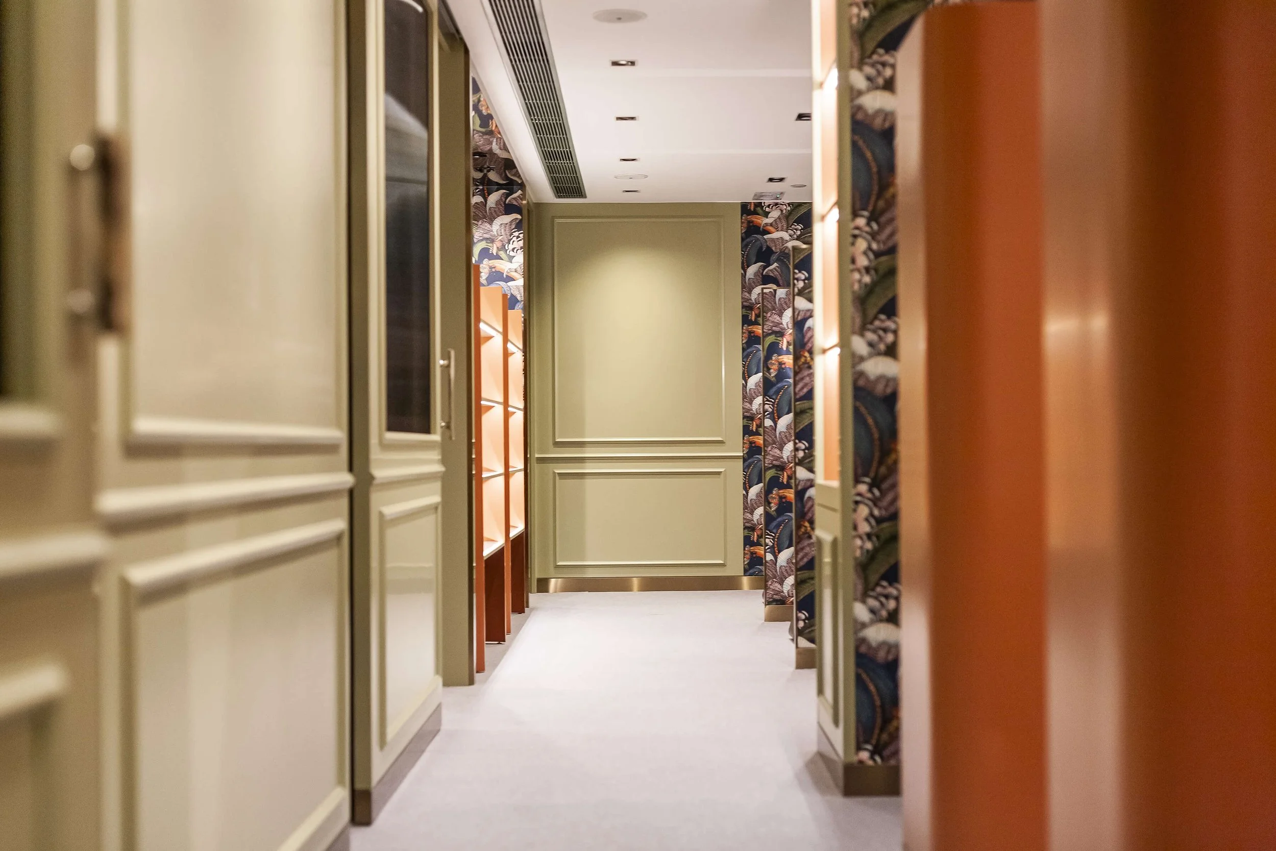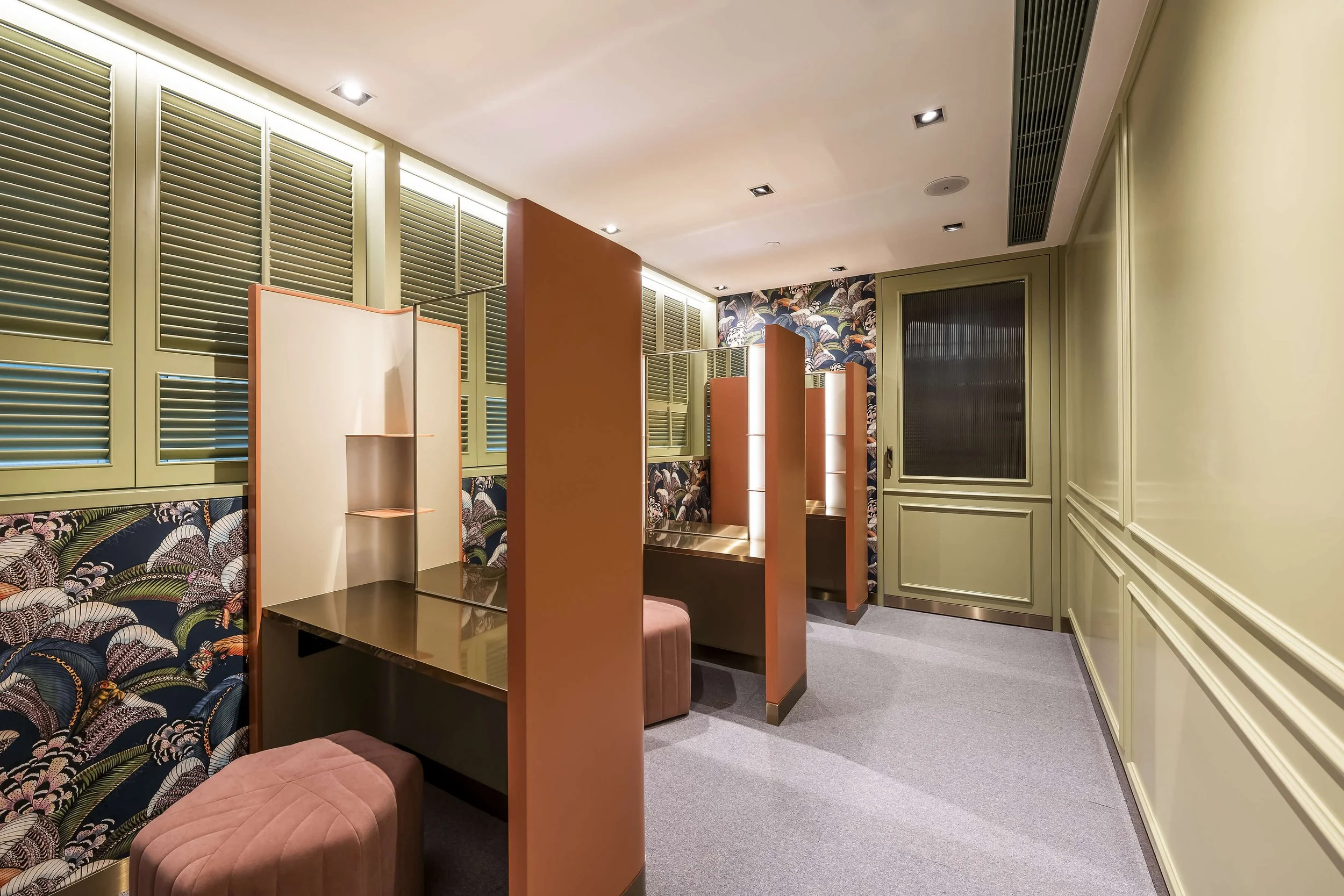 The reception and consultation areas feature tea green molding wall panels and window shutters, complemented by vibrant cantaloupe vanity counters, product units, and a seating bench adorned with brass skirting. This combination exudes a calm, cool glamour, creating an indulgent atmosphere for clients. In contrast, the lush leaves, fronds, and floral patterns of Cole & Son wallpaper form a peaceful labyrinth that reveals the wonders of nature upon closer inspection.