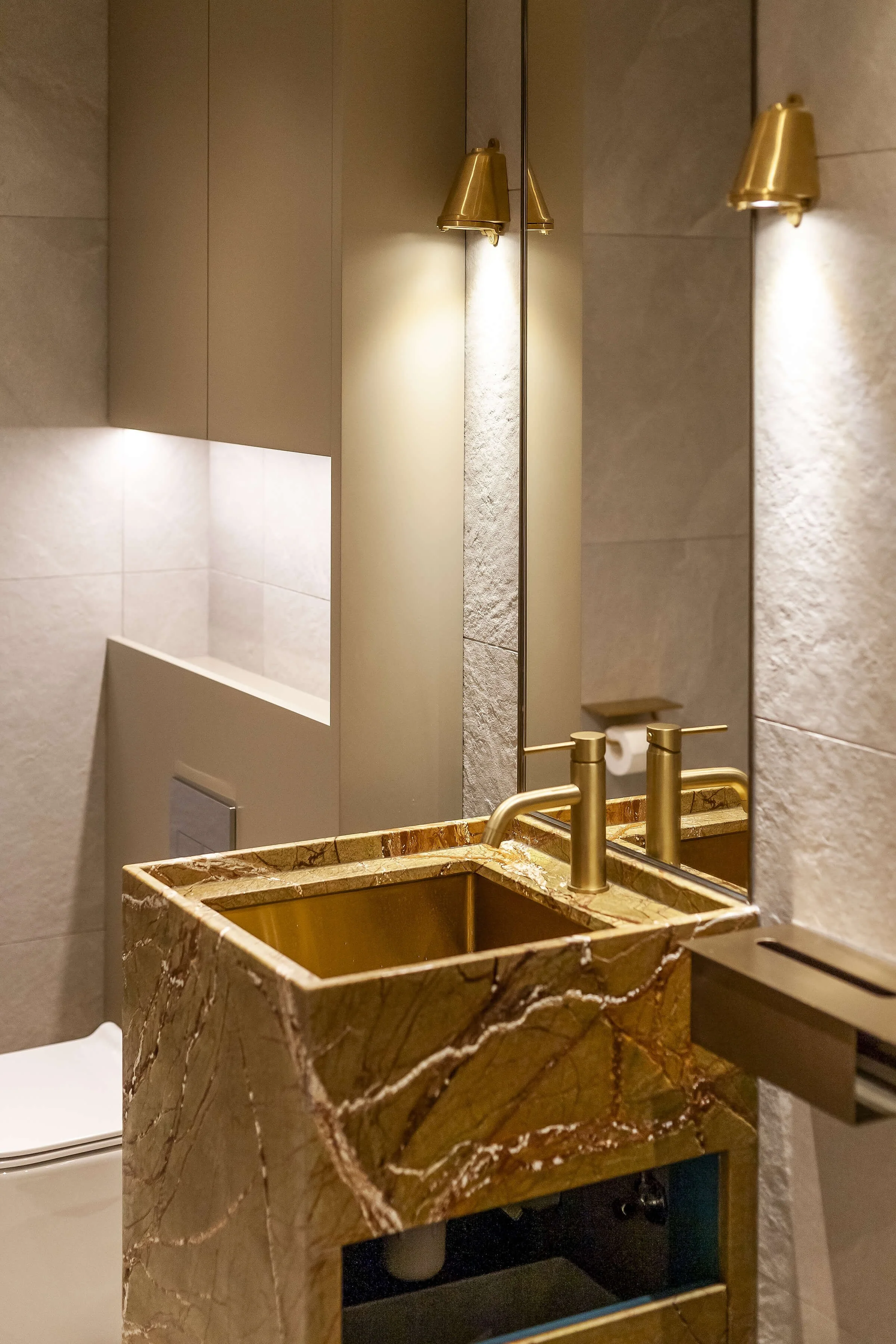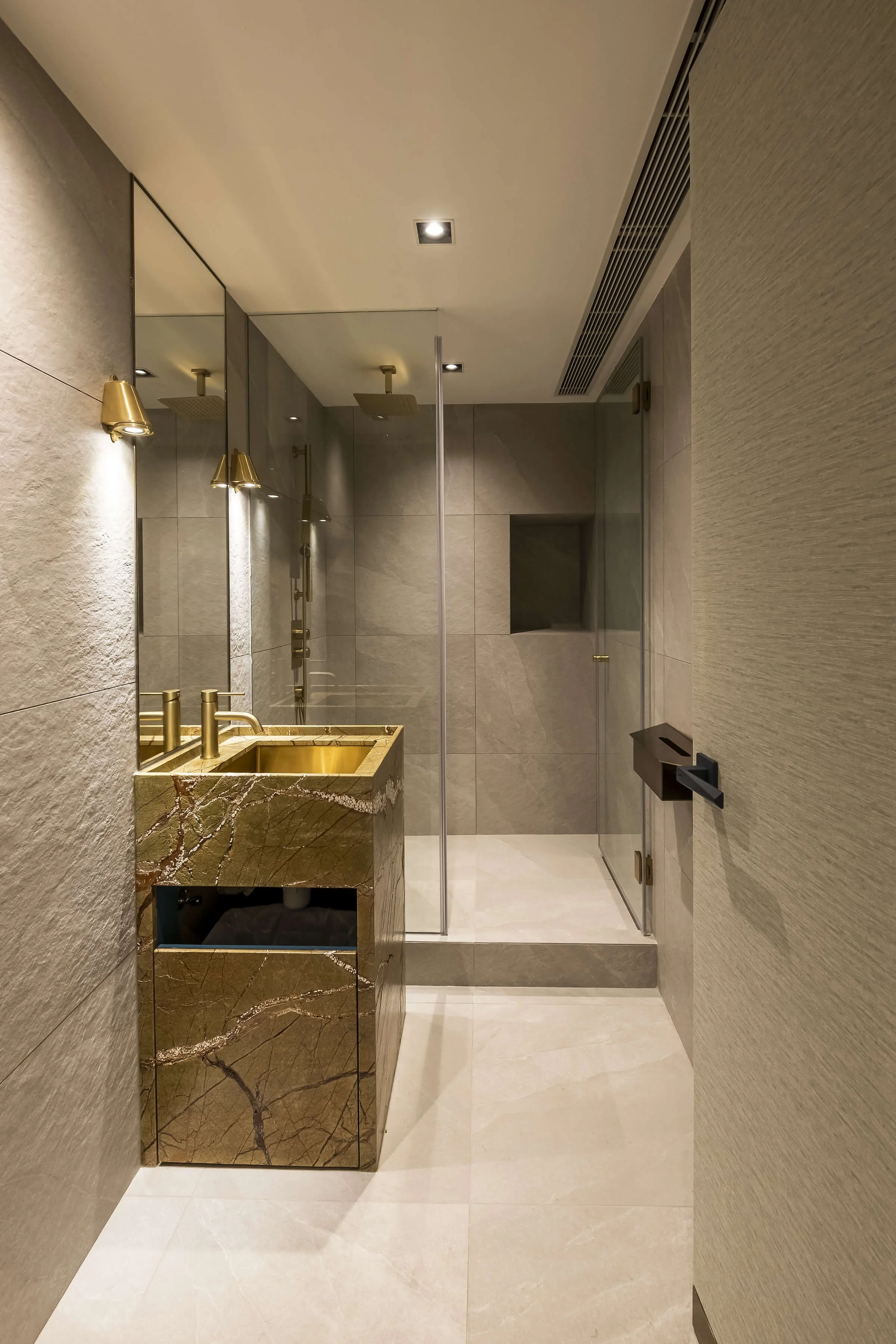 Finally, the bespoke sink unit in luxurious rainforest stone showcases an exquisite blend of mossy green and rustic red veins, giving the Changing Room personality, freshness, and a botanical garden feel. The addition of brass wall lights, sink fixtures, and mixers provides a perfect contrast to the matte-finished stone and wall tiles, elevating the charm of the entire space.