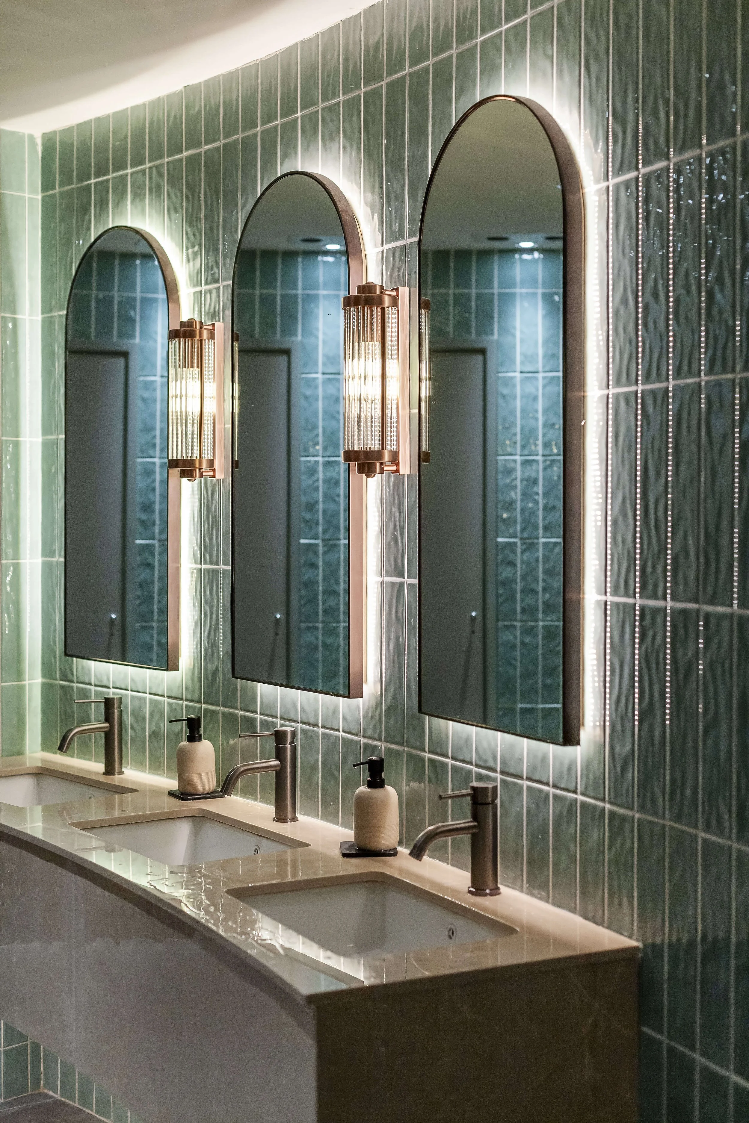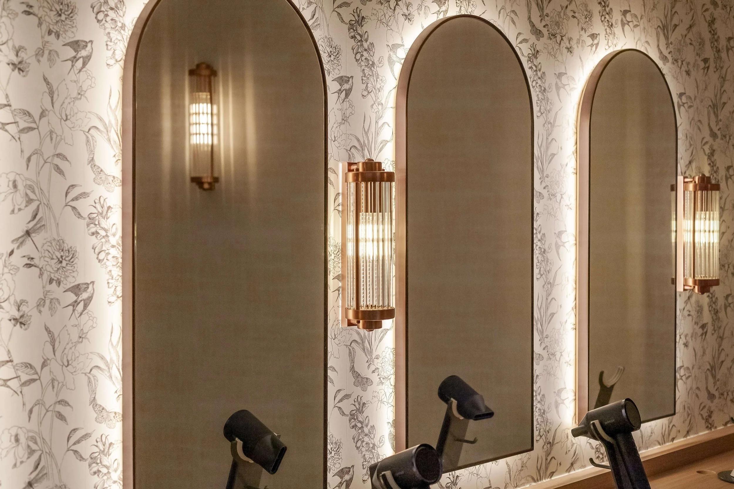To create a modern appeal and calm atmosphere, we introduced a delightful combination of anodized rose gold, marble mosaic and flora.