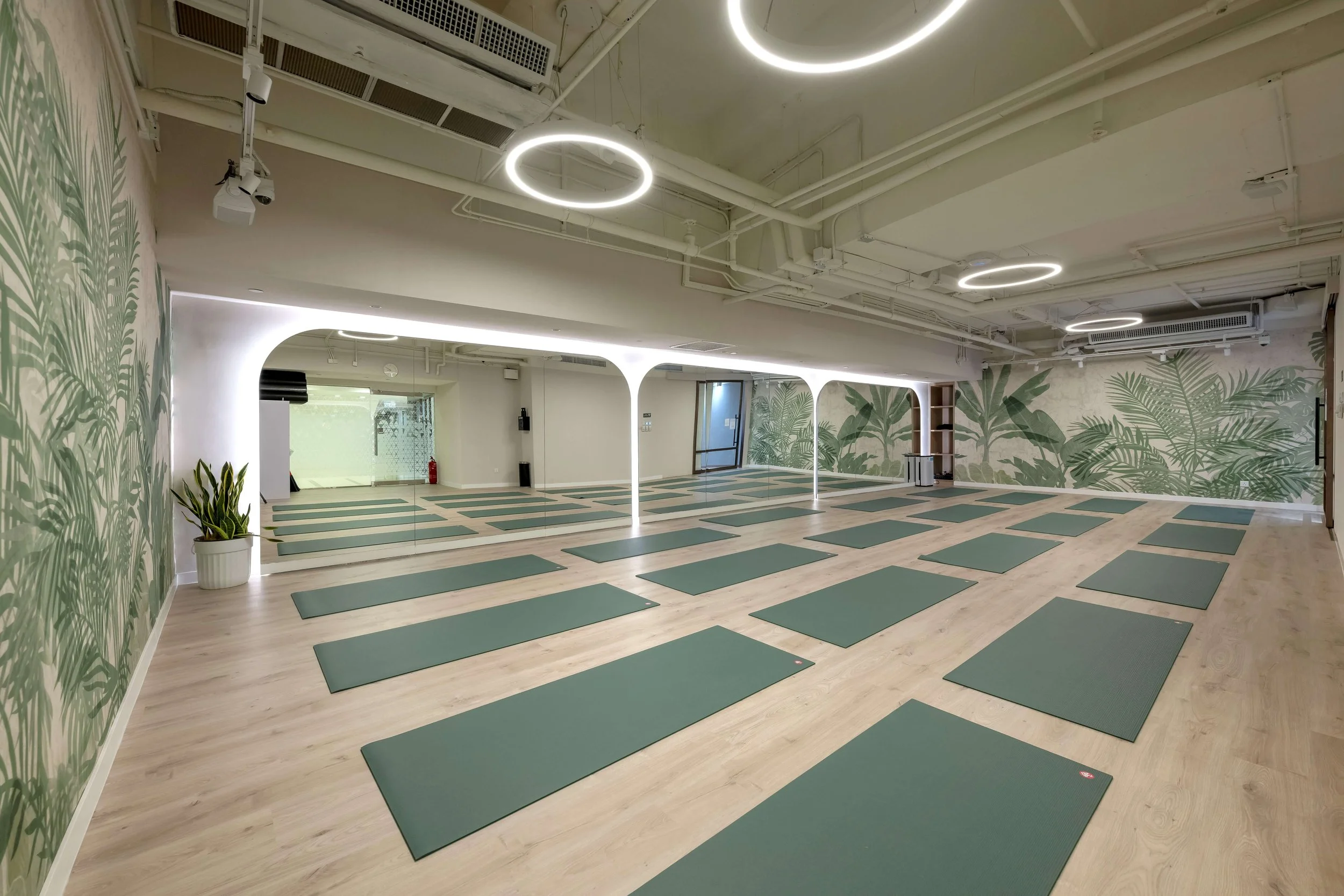 To create a natural tranquility for the yoga studio, we incorporate greenery, ambient lighting, paired with subtely curved mirror walls.