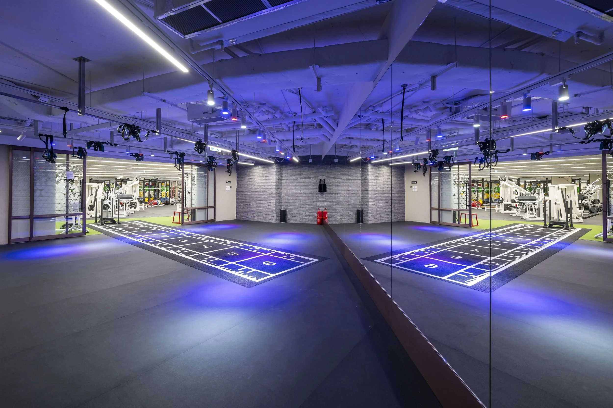 The burn room takes on a modern industrial design with special RGB lighting, giving a visually captivating and energizing environment to motivate gym-goers, enhancing their workout experience.
