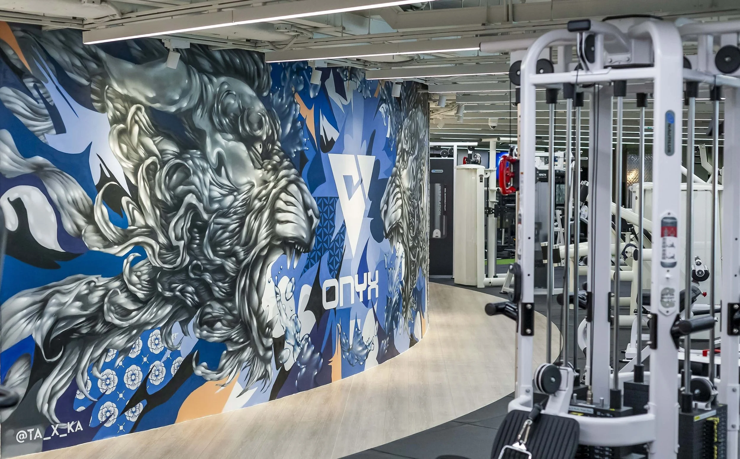 The Functional, Cardio, and Strength zones are thoughtfully arranged in a spacious circular layout, providing ample room for movement. The flooring features high-performance rubber and turf, designed for versatility and intense workouts. We worked with reknowned grafitti artist Taka to create the centrepiec making for an inspiring backdrop for the trail blazing gym equipment.