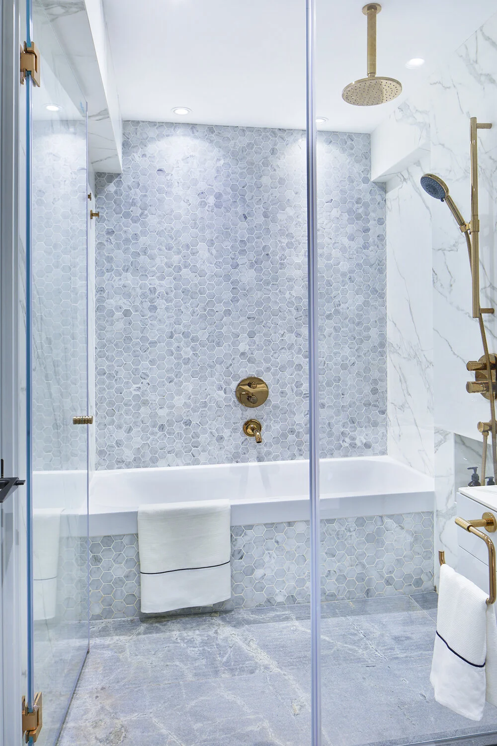 Careful attention is always paid to choosing materials. Custom-cut hexagonal marble mosaic forms a textured master bathroom feature wall juxtaposing against the surrounding smooth white Carrara marble. No detail is ever overlooked - the hinges and doorknob of the glass shower door were specially anodised to perfectly match the brass sanitary hardware fittings.