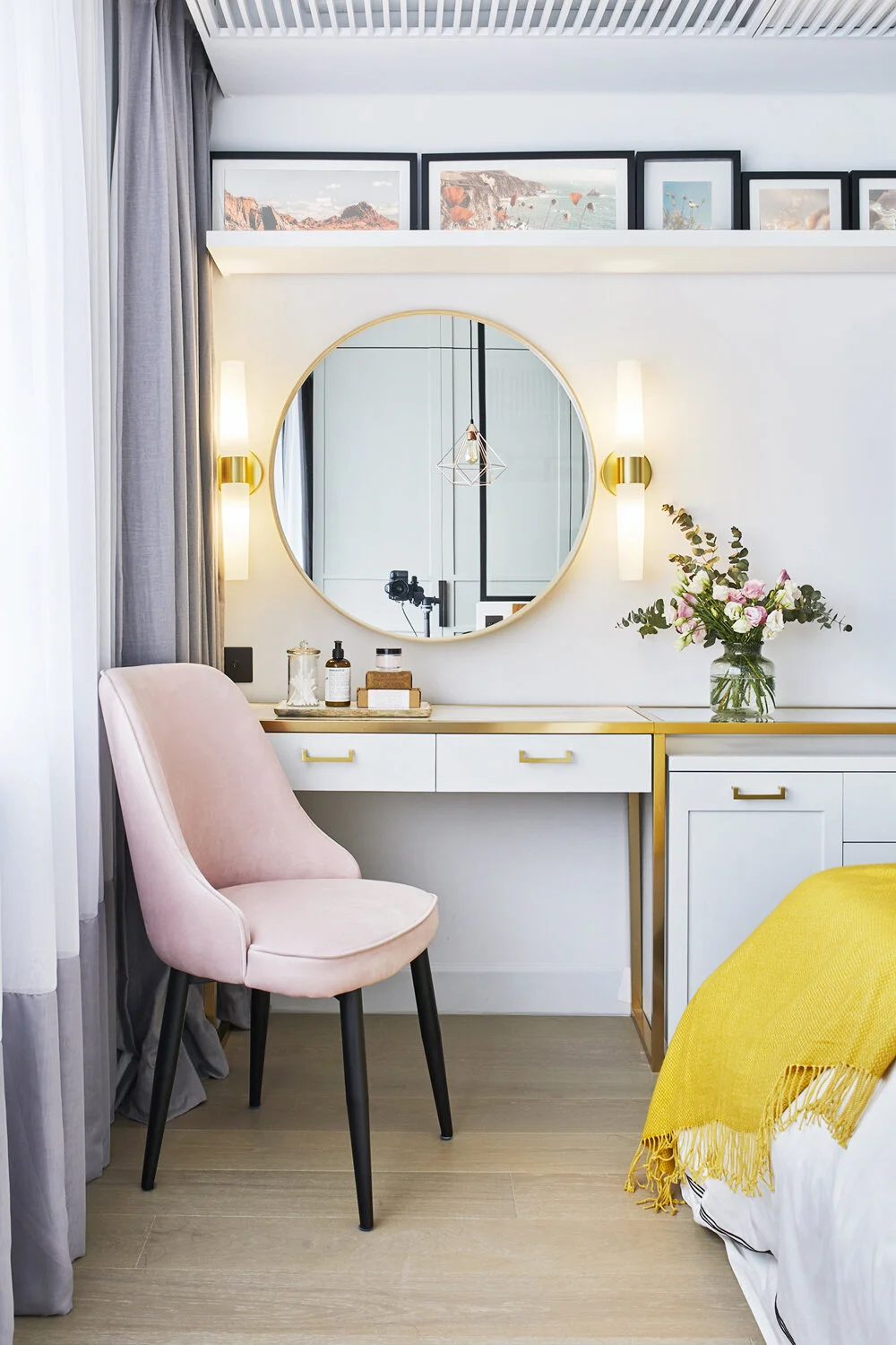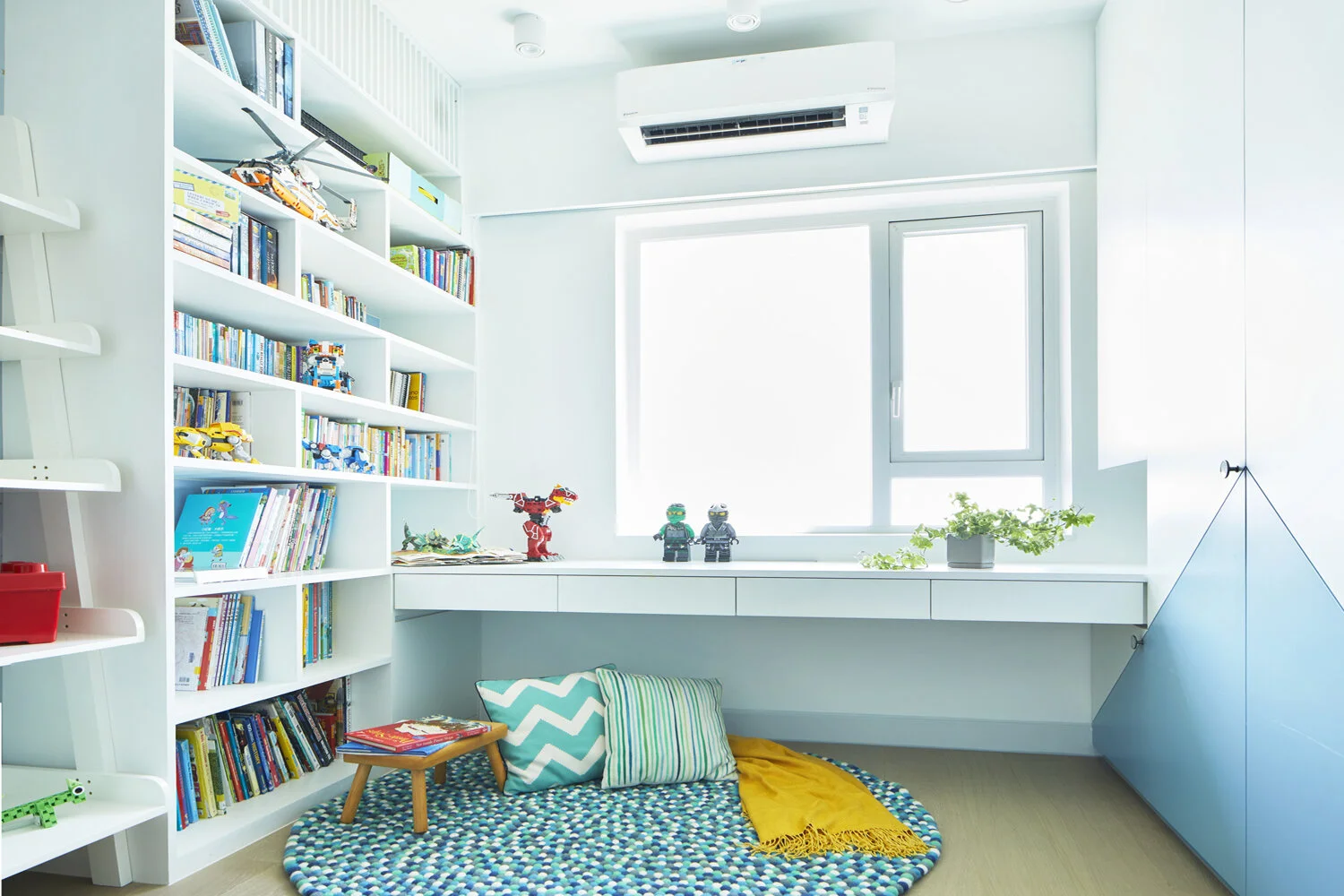Clever space planning was incorporated to ensure that not only do all the rooms function to meet the needs of a family of six, but are aesthetically beautiful as well: behind the paneling in the living room are hidden storage units in addition to a fully functional office area; a transparent semi-open walk-in closet was created within the roomy master bedroom; a separate shower was added to the master bathroom without having to sacrifice the bath; and ample storage was added to the streamlined sage green kitchen.