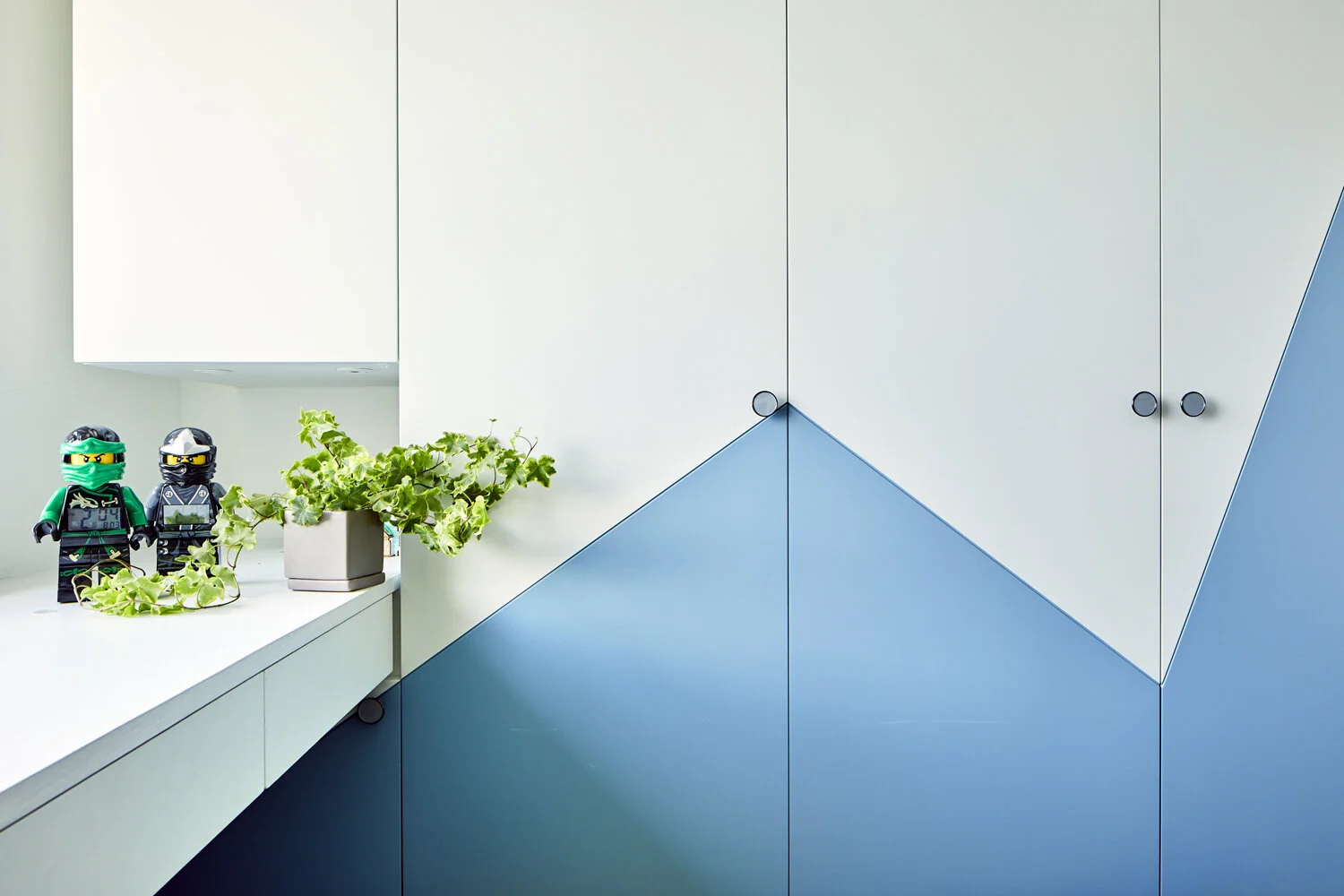 The surrounding mountains were the inspiration for the custom-painted graphic pattern on the boys’ bedroom wall and bespoke wardrobe design. The patterns in the rooms evoke an energy that is reminiscent of its inhabitants.